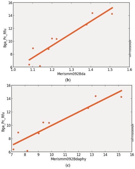 Results of MERISMM092BDA algorithm (Mishra and Mishra, 2009) as raw BGA index values as applied to synthetic MERIS imagery with brighter pixels in the reservoir indicating higher BGA values (a). Evaluation via observed (Y axis = BGA_PC_RFU) vs. predicted (calculated) raw BGA index values (MERISMM092BDA) values with Pearson’s r2 (r2 = 0.863, p < 0.001, n = 9 due to large pixels) (b). Evaluation via observed (Y axis = BGA_PC_RFU) vs. normalized predicted (calculated) BGA (MERISMM092BDA) values with Pearson’s r2 (r2 = 0.863, p < 0.001, n = 9 due to large pixels) (c). Details of the synthetic bands and band math are available in Table 1 and Table 2, respectively.