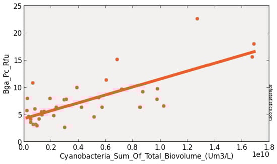 Comparison of optical sonde BGA values (Bga-PC-RFU) vs. laboratory determined Cyanobacterial Sum of Total Biovolume values measured in Harsha and a nearby reservoir on the same days with Pearson’s r2 (r2 = 0.757, p < 0.001, n = 39).