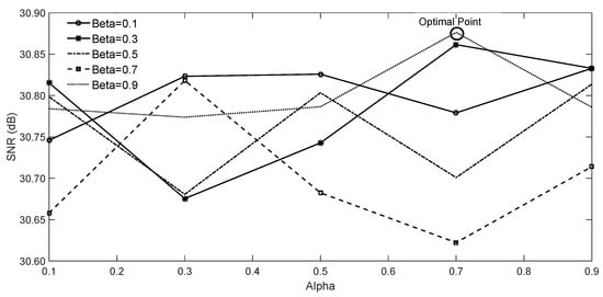 The value for has been set empirically to 25. For the ODL algorithm used in this paper, 3481 patches of size are used, and the number of atoms is 256. In order to select appropriate values for and , the performance of the proposed algorithm has been evaluated for different values of and . A combination of the MSI from the same scene and unrelated QuickBird PAN images (http://glcf.umd.edu/data/quickbird) are considered. Figure 2 displays the SNR results for the Pavia dataset in function of and . For the Pavia dataset, the optimal values of and are found to be 0.7 and 0.9, respectively (Figure 3). For the Shiraz dataset, optimal values for and are 0.3 and 0.9 respectively. However, from Figure 2 and Figure 3, it can be noticed that SNR(dB) values vary only slightly, and any random choice of and is reasonable.