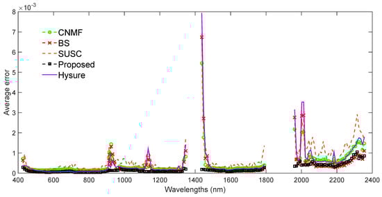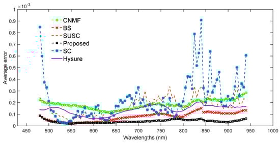 The proposed method (SUBS) shows the best performance, with a reduced spectral distortion, because of the spectral unmixing procedure, and an improved spatial resolution, because of the modified BS procedure. In fact, the reconstructed images by the proposed method are visually very close to the ground truth image. The squared error between ground truth and reconstructed spectra of the Pavia and Shiraz datasets are plotted. The average and max-min errors for all methods show that the proposed method has the lowest spectral errors. These errors are the least sensitive to the band regions. The spectral error of the SC method is very high because, in this method, the dictionary does not account for the spectral correlation of the HSI, which induces spectral distortion in the reconstructed images.