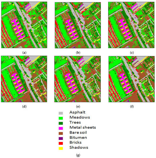 In order to demonstrate the effect of the fusion on further analysis, the impact of the proposed method on the classification accuracy is investigated. The subset of the Pavia dataset contains a labeled training set, including six classes (Asphalt, Meadows,Trees, Painted Metal Sheets, Self-Blocking Bricks and Shadows). Ten percent of the available labeled samples are randomly selected for training an SVM classifier. The overall accuracy and kappa coefficient of the fused images using the various fusion methods are shown in Table 3. Figure 7 shows the obtained classification maps. The applied SVM algorithm is taken from the LIBSVM library [] by using the Gaussian kernel with five fold cross-validation.