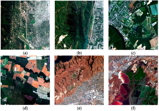 To assess the performance of noise estimation algorithms adopted in KMNF and OKMNF, six real Airborne Visible/Infrared Imaging Spectrometer (AVIRIS) radiance images with very different land cover types were used in this experiment. These images are shown in Figure 1. Each of them contains 300 × 300 pixels, and covers spectral wavelengths from 400 nm to 2500 nm. Normally, the random noise in AVIRIS sensor images is mainly additive and uncorrelated with the signal [60]. More detailed descriptions are shown in Table 1.