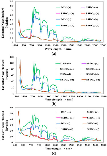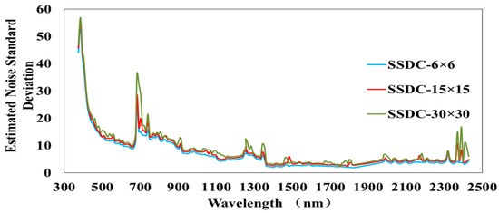 We analyze the influences of sub-block size by using hyperspectral image as shown in Figure 1a. From the experiments, we found that, when the sub-block size is 4 × 4, or 5 × 5, some sub-blocks are homogeneous and have similar DN values in certain bands; thus, it makes the matrix inversion in multiple linear regression infeasible. When the sub-block size is too large, such as 15 × 15 and 30 × 30, some sub-blocks contain multiple types of earth surface features, and the results of noise estimation become inaccurate and instable. When the sub-block size is 6 × 6, as shown in Figure 2 and Figure 3, the results of noise estimation are reliable and stable. Therefore, we set the sub-block size to 6 × 6 for SSDC, SSDC1 and SSDC2. The width and height of each sub-block are set as = 6, = 6.