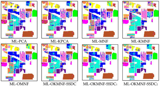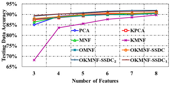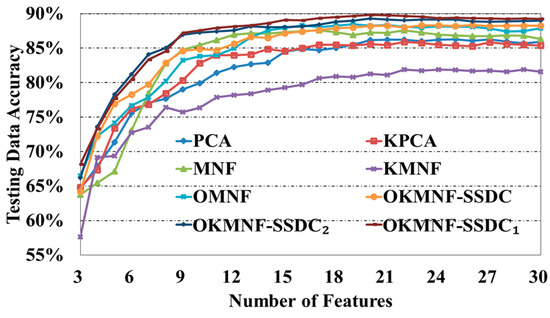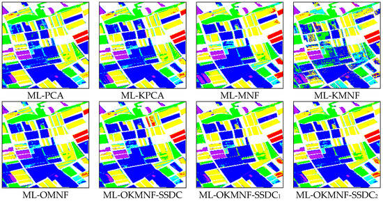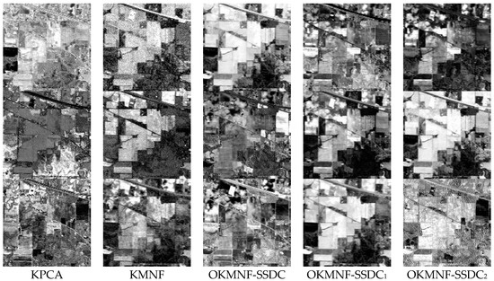 Based on the experiment of assessing the performance of dimensionality reduction methods from Section 3.3.2, it can be seen in Table 5, and Figure 11 and Figure 13 that the performances of PCA, KPCA, MNF, and OMNF are very similar, and all of them are better than KMNF. When we optimized the KMNF method through SSDC, SSDC1 and SSDC2 noise estimation, the performance of KMNF was greatly improved. OKMNF gets much better results than KMNF, and also performs slightly better than the other four dimensionality reduction methods.