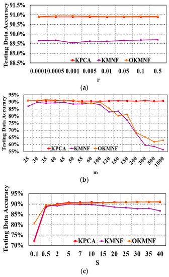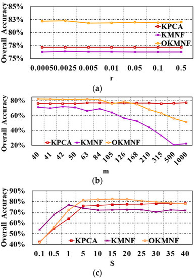 where and are vectors of observations, , is the mean distance between the observations in feature space and is a scale factor [33,37]. Figure 7c and Figure 12c show the sensitivity of KPCA, KMNF, and OKMNF with respect to . We can see that both OKMNF and KPCA show better performance than KMNF. In the Indian Pines scene, OKMNF performs better than KPCA. Just like above, we adopt the optimal value of parameter within the range of requirements when the classification accuracy of hyperspectral images achieves the maximum value. According to our empirical study, of KPCA, KMNF, and OKMNF are set to 35, 1, and 15 for the Indian Pines scene, respectively. Then, for the Minamimaki scene, of OKMNF is set to 25, and of KPCA and KMNF are both set to 10.