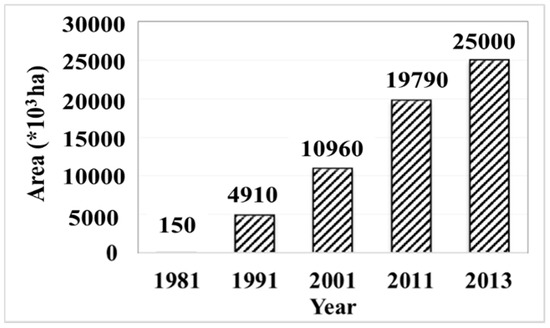China is considered to be one of the largest PMF planting countries in the world. By 2013, PMF had a total coverage of 25 × 106 ha in China [45,46] (Figure 1). According to Liu et al., PMF has increased the yield of economic food crops by 20%–30% and the yield of grain crops by 20%–60% [47], contributing significantly to the sustainable development of agriculture in China.