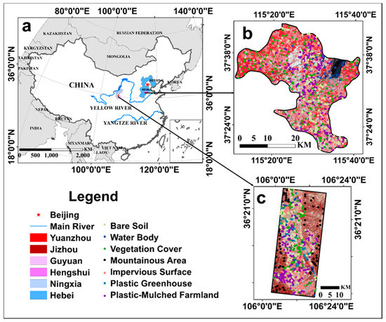 (a) The locations of the two study areas; (b) the study area of Jizhou (Landsat-8 OLI (Operational Land Imager) image, display composite: R = near-infrared, G = red, B = green); and (c) the study area of Guyuan (Landsat-8 OLI image, display composite: R = near-infrared, G = red, B = green).