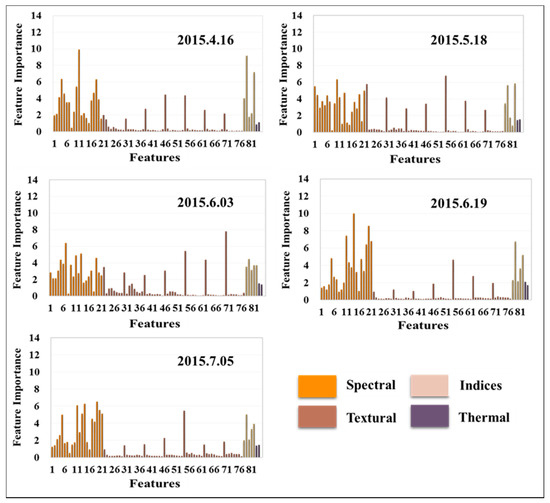 Figure 5 shows that there were obvious differences in the importance of different features, which changed with the development of the growing season. In the whole growing season, the spectral features took a dominant position, the indices features and textural features (except for the mean) were inferior to spectral features, while the thermal features were inferior to the others. In 16 April, the spectral and indices features were more important than the other features. In 18 May and 3 June, the spectral and indices features and textural feature of mean were more important than the other features. The importance of some textural features in 18 May were slightly higher than that in 16 April, although this importance was reduced after this time period. In 19 June and 5 July, the spectral and indices features were also the more important feature for PMF mapping.