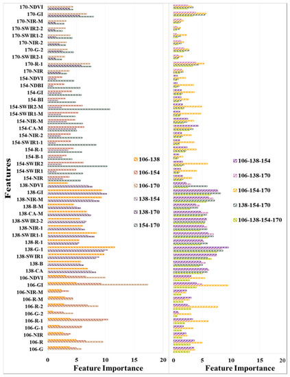 In our experiment, RF was performed to measure the importance of all features in each single temporal feature set and each multi-temporal feature set, respectively. Two parameters were set beforehand: the number of trees and the number of variables. A total of 500 trees were grown each time, and the square root of the number of total input features were used as the number of split variables in this paper. Due to the randomness of RF, calculated feature importance varied slightly across different runs. To avoid these differences, we repeated the feature importance measurements ten times and calculated the average importance value. Following this, the features were sorted in descending order of their average importance, and the cumulative average importances were calculated for each single temporal feature. Next, we developed feature sets according to the cumulative percentage of feature importance for mapping PMF. For these features, the cumulative percentages were 30%, 50%, 80%, 90%, and 100%. After this, we chose the feature set with the highest accuracy to develop the multi-temporal combined features.