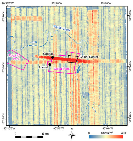The basis of this study was a LiDAR survey conducted over an area of approximately 20 × 20 km2 around the Maya site of Ceibal, Guatemala, during the 2015 field season of the Ceibal-Petexbatun Archaeological Project (CPAP) (Figure 1). Ceibal is the largest center in the Pasión region of the southwestern Maya lowlands, and its main occupation spans from 1000 BC to AD 900 or 950. Including the zones along the edges without an overlap of flight strips, the LiDAR data covered an area of 460 km2. This area receives a larger amount of precipitation (roughly 1800 mm annually) and its rainforest tends to be higher and denser than in the central and northern Maya lowlands [24]. The forest around Ceibal is protected as a national park, along with the Rosario Park in the same region, although some parts suffered illegal deforestation by squatters in recent years. Vegetation in most areas outside these parks has been substantially modified for agriculture, cattle ranches, and oil palm plantations. Diverse vegetation types in this region present a challenge to the application of LiDAR data for archaeological studies.