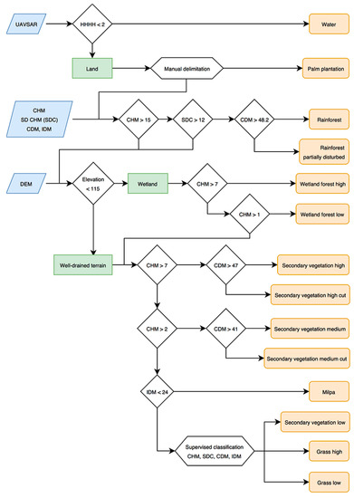 Figure 4 summarizes the workflow of our OBIA vegetation classification. Before this analysis, the cell values of CDM, SD CHM, and IDM were scaled in a range from 0 to 50 to be equivalent to the CHM values. Although the scaling of data is not necessary for OBIA classification using threshold values, it facilitates the intuitive understanding of variation among different data sets. In addition, scaled data can be used without additional manipulations in case we decide to conduct supervised or unsupervised classification with Erdas Imagine or other programs, for which such data normalization is recommended. In the OBIA analysis, we first classified bodies of water, using UAVSAR data. UAVSAR uses L-band radar (1.26 GHz/0.2379 m with a bandwidth of 80 MHz), and its dual-polarized SAR data (polarization of radar waves at transmission and reception) distinguishes water clearly even under thin vegetation [57,58]. As indicated by other scholars [59,60], we found the HH polarization (horizontal transmit and horizontal receive) the most effective in the discrimination of water bodies (Figure 3e). We used a multiresolution segmentation scale value of 30, which generally produced a single segment for a small pond. A threshold value of 2 for the UAVSAR HHHH product gave the best delineation of water when compared to the orthophotos. Then we manually delineated palm plantations, which can be easily identified in the DEM and DSM. The automated classification of palm plantations is difficult because they include diverse vegetation cover, including palms of different growing stages and dense undergrowth (see Section 3.3).