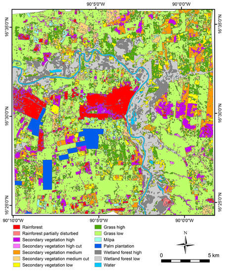 After each step of classification, we merged classified areas and removed isolated small segments with eCognition’s minimum mapping unit function, using the following pixel sizes: 21 for water, 300 for rainforest and 201 for the rest, 500 for wetland forests, 90 for high secondary vegetation, 300 for medium secondary vegetation, 63 for milpas and 50 for the rest of low vegetation areas, and 100 for low secondary vegetation, high grass, and low grass. In addition, after the classification of water, we smoothed its edges with a scale value of 2. After all the classifications, we also smoothed the edges of classified areas, except water and palm plantations, with a scale value of 30. In the final step, we exported shape files for all vegetation categories from eCognition, which were then used for calculating the statistics of LiDAR data and of ground-truthing results by vegetation types with the zonal statistics and spatial join tools of ArcMap.