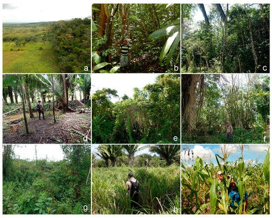 Examples of vegetation types (photos Nasu, Ranchos, and Pinzón). (a) Northern edge of the Ceibal Park with rainforest, pasture, and milpa. (b) Undisturbed rainforest. (c) Uncut high secondary vegetation. (d) Partially-cut high secondary vegetation. (e) Uncut medium-high secondary vegetation. (f) Partially-cut medium-high secondary vegetation. (g) Low secondary vegetation. (h) High grass. (i) Milpa.