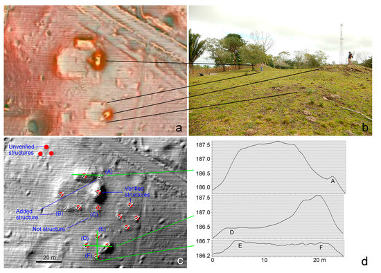 For bare fields and areas with low grasses or pastures, LiDAR provided high-resolution data that allowed us to identify many of subtle features. Our field investigations demonstrated that the vertically precision of LiDAR better than 2 cm allowed us to identify cultural features measuring 10 to 20 cm in height in ideal conditions. These low structures commonly consisted of one course of 10 to 30 cm high stones that were partially buried in the ground. For example, Structure E shown in Figure 11c,d were 20 cm higher than the patio area, and Structure F (also seen in the foreground of Figure 11b) were 10 cm higher. Calibration errors of LiDAR resulted in vertical discrepancies of 2 to 8 cm between different flight paths, which is seen as east-west stripes in DEM visualizations (Figure 11c) and subtle undulations in north-south elevation profiles (Figure 11d bottom). Although Structures E and F were still identifiable, these errors made the detection of features lower than 10 cm nearly impossible. The configurations of structure groups, often surrounding a patio, also aided the identification of low buildings. Since the Maya nearly always built structures in elevated locations for better drainage, the back sides of these buildings usually formed downslopes. Structure D, for instance, did not show recognizable difference in elevation from the patio area (Figure 11d), but its well-defined edges on its back and lateral sides facilitated its detection. Nonetheless, when the edge of a structure and that of the underlying platform coincided or when structures were located on slopes, some misidentifications occurred (Structure A in Figure 11c,d). When low structures did not exhibit regular configurations of patio groups, their identifications were more difficult.
