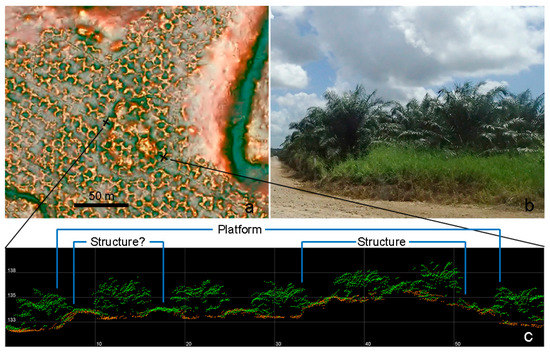 LiDAR data of an oil palm plantation. (a) RRIM showing a probable group of structures. (b) View of an oil palm plantation (not the same area) (photo Nasu). (c) Point cloud profile showing palm trees and probable structures (Orange = ground points; green = vegetation points).
