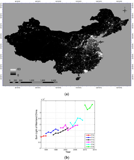 Study area and its DN values: (a) NTL data of Mainland China in 2002 by DMSP/OLS; (b) summation of DN values over years for different satellites before inter-calibration.