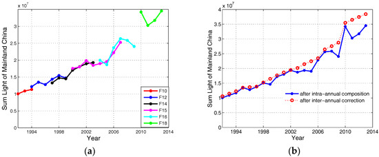Summation of DN values over years for different satellites after preprocessing: (a) inter-calibration; (b) intra-annual composition and inter-annual correction.