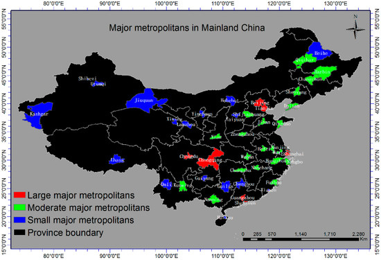 Metropolitans in Mainland China have the same boundaries as the administrative divisions, which typically include central cities and the surrounding counties or towns [39]. In this study, a total number of 45 major metropolitans were selected owing to the availability of socioeconomic data. Basically, the metropolitans should be selected with a good spatial coverage. As shown in Figure 3, according to the population in 2013, we selected 7 cities (with population greater than 10 million) as large major metropolitans, 21 cities (with population greater than 5 million but less than 10 million) as moderate major metropolitans, 17 cities (with population less than 5 million) as small major metropolitans. As shown in Figure 3, the selected metropolitans are in general evenly distributed in Mainland China. Besides, simple statistic information suggests that the selected metropolitans take a proportion of 21.6% in population and have a percentage of 44.4% in Gross Domestic Product (GDP) in 2013.