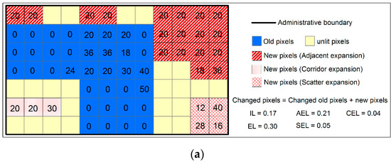 where in the year t, EL(t) is the expansion level, NP(t) is the set of new pixels, and AreaNP(t) is the extent of new pixels. Thirdly, expansion in metropolitan is examined by using spatial aggregation method on new pixels to identify three spatial types, namely adjacent, scatter, and corridor expansion (c.f. Figure 4a). Adjacent expansion can be detected as the agglomeration of new pixels that are spatially adjacent to at least one old pixel; scatter expansion can be identified as the agglomeration of new pixels that are isolated from any old pixels and has a relative large value of shape index (SI); corridor expansion is similar to the definition of scatter expansion except that it has a relative small value of SI. In this study, the shape index (SI) of the agglomeration is defined as Equation (3).