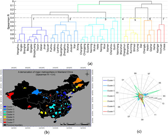 Clustering of major metropolitans: (a) Dendrogram of major metropolitans; (b) Map of the 7 clusters; (c) Polar plot of IL over time with respect to the clusters.