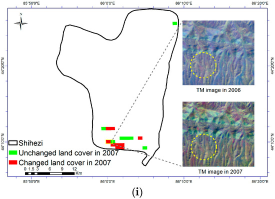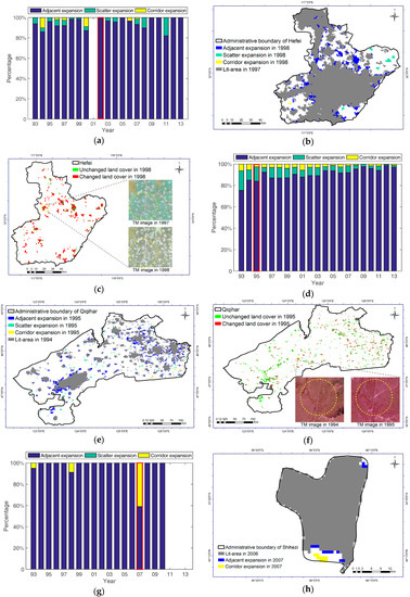 Individually, we argue that the expansion of each metropolitan should be represented by a mixture of three spatial types evolving with time. For the ease of illustration, three metropolitans are selected with large values of AEL, SEL, and CEL. Firstly, Hefei is selected as a representative of adjacent expansion. As shown in Figure 8a, it displayed pure contiguous expansion in 11 years, and map in Figure 8b visualized where adjacent expansion occurred in 1998, and map in Figure 8c displayed the actual spatial changes of land cover in Landsat TM images with an overall accuracy (OA) of 86.9%. Secondly, Qiqihar is selected as a representative of scatter expansion. As shown in Figure 8d, it displayed scatter expansion from 1993 to 2013 although its proportion was in a decreasing trend, and map in Figure 8e illustrated the intensely distributed scatter expansion with malachite green color in 1995, and map in Figure 8f displayed the actual spatial changes of land cover in Landsat TM images with an OA of 78.4%. Thirdly, Shihezi is selected as a representative of corridor expansion. As shown in Figure 8g, we can see that it only experienced adjacent and corridor expansion in the two decades and a corridor expansion occurred in 2007. Map in Figure 8h depicted a clear belt-shaped corridor expansion near the south of its administrative boundary with yellow color, and map in Figure 8i displayed the actual spatial changes of land cover in Landsat TM images with an OA of 56.3%. Therefore, these results can be useful for the policy making or planning under sustainable urban development.