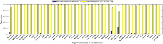 Secondly, the quick saturation problem of DMSP/OLS sensors is a potential limitation on using IL. For instance, an increase in radiance for a saturated pixel would not be detected if its DN value was already 63 in the previous year. To quantitatively understand this limitation, we compute the average percentages of saturated pixels (DN value = 63) and unsaturated pixels (DN value < 63) from 1993 to 2013 for individual metropolitans respectively. As shown in Figure 9, three facts can be observed: (1) All major metropolitans have a larger percentage of unsaturated pixels than saturated pixels; (2) For each metropolitan on average, 98% of lit-pixels are unsaturated, and only 2% of them are saturated; (3) The top three metropolitans with the largest percentages of saturated pixels are Shenzhen with 24%; Shanghai with 19%; and Beijing with 8%. Hence, the results on the growth patterns of Shenzhen and Shanghai require further investigation, but the results on all other metropolitans should be reliable due to the negligible influence of quick saturation problem on growth patterns. This is another major reason why we examine growth patterns using lit-pixels.