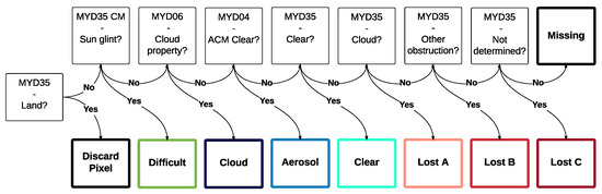 When all classes containing cloud, aerosol, clear area or sun glint are taken together, the lost pixels are what remains. For these pixels neither aerosol nor cloud retrievals exist, still they are classified as containing a cloud (Lost A), a non-cloud obstruction (Lost B), or were not processed at all in the cloud masking (Lost C), as shown in Figure 1. Non-cloud obstructions could be an aerosol-laden atmosphere characterized by smoke, biomass burning or dust aerosol [11]. The Cloud Mask retrieval fails where all the radiance values used in the cloud mask are missing or outside the permitted range [11] or due to geolocation problems [20]. An example scene classified in this way is shown in Figure 2.