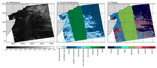Example scene for the classification procedure with (a) reflectance; (b) cloud classification (combining MYD35 and MYD06); and (c) the resulting classes for 19 August 2007 at 9:30 am.