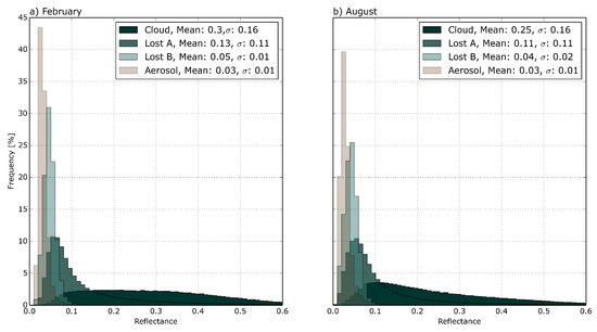 The reflectance of class “Lost B” (5% in February and August) is fairly homogeneous globally, as shown in Figure 5g,h. The properties of these pixels are in the range between the “Lost A” pixels and the “Aerosol” pixels (Figure 6). It can be speculated that these pixels are partly hydrated aerosols, which represent the cloud formation process, or thin clouds [1,10]. Striking is the slightly increased reflectivity in regions with high aerosol loading, e.g., the South-East Atlantic or the Arabian Sea in August or the windblown Saharan dust in February over the Atlantic Ocean (Figure 5g) [25]. Additionally, the decreasing reflectance with larger distances, as well as higher frequencies at higher distances to the nearest cloud in comparison with class “Lost A”, indicate that these pixels are not directly influenced by clouds (Figure 8c), but aerosol swelling alters the reflective properties. This class is characterized by the presence of aerosols, but there are no aerosol retrievals. This is underlined by the increased reflectances found in Lost B in the immediate surroundings of aerosol pixels, as seen in Figure 8d.