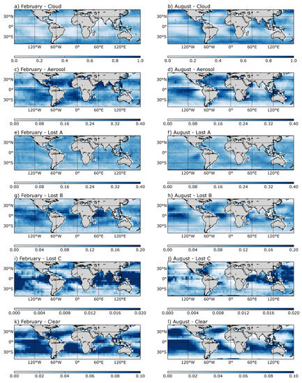 Figure 4 shows the global distribution of the occurrence frequency of all classes, as the ratio of amount of the pixels of each class and all pixels, for February and August respectively. Within each month, the spatial frequency distributions of classes are complementary, in particular the locations of cloud and aerosol classes (Figure 4a–d). Examples of note are the South-East Atlantic region in August, and the ITCZ in both months indicated by the increased cloud occurrence frequency (Figure 4a,b).