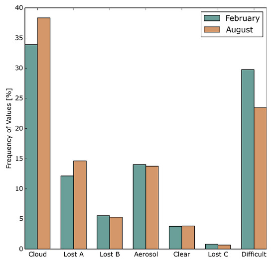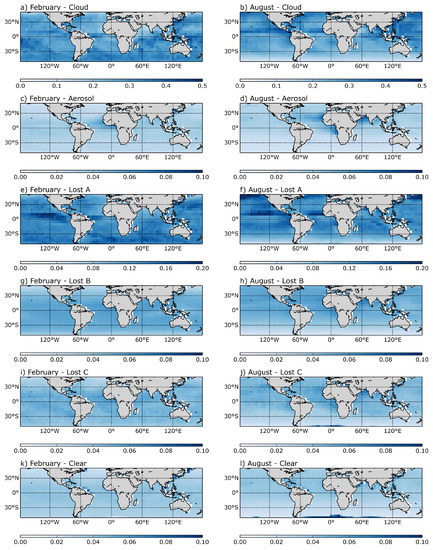The class “Lost C”, with a global fraction of nearly 1% in February and August, represents pixels where retrievals are impossible for a range of reasons other than the physical phenomena contained in the other classes (see above). Striking patterns are the reflective properties and the global distribution, especially in regions of high aerosol loadings, e.g., the South-East Atlantic in August (Figure 5j), when biomass burning occurs [2]. In February, there is a northward shift of the region at the west coast of West-Africa indicated by high mean reflectances (Figure 5i) with the relocation of the biomass burning region and the increasing Saharan dust winds [2]. A possible explanation could be that these pixels include hydrated aerosols, but also discarded aerosol pixels from the aerosol-clear interpolation, described in Section 2, which is supported by the high occurrence frequency near aerosol pixels (Figure 8f).