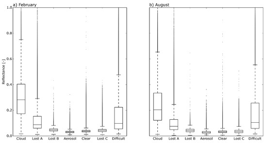 For all pixels belonging to each class, reflectance information is extracted from the 0.645 m channel measurements as shown in the sample scene in Figure 2a. In order to harmonize sample sizes for the classes, random samples of 500,000 data points are chosen for each class, evenly distributed over all five years with 100,000 data points for each February and August. A summary of the reflective properties of these samples for the classes Cloud, Lost A, Lost B and Aerosol is shown in Figure 3 with mean values and standard deviations, respectively.