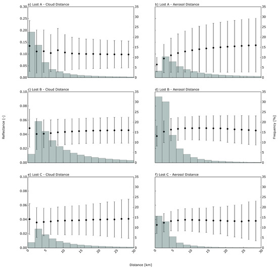 Reflectances and frequencies as functions of distance to nearest cloud pixel (left-hand column) and aerosol pixel (right-hand column) with lines representing the reflectances and bars the frequency of occurrence. The median of the reflectances is marked by dots and line ends correspond to the 1.5 inner-quartile range of the reflectances.