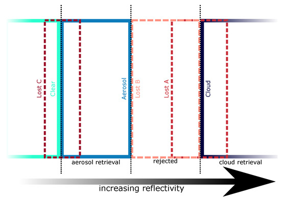 Schematic placement of the ”Lost” classes relative to aerosol and cloud retrievals with increasing reflectivity (based on [6]); colors of each class correspond to those used in Figure 2c.