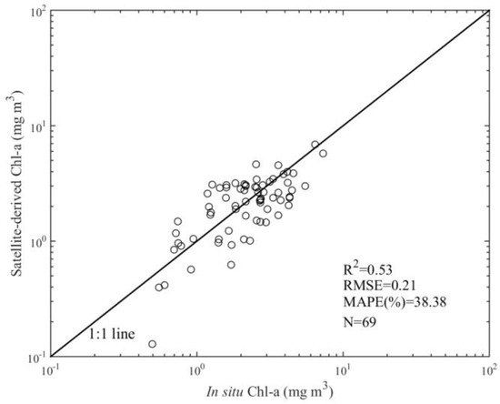 Comparison of satellite-derived Chl-a with in situ measured values.