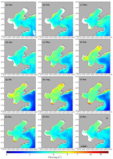 The seasonal patterns of Chl-a in each month from 2000 to 2012, represented by climatological monthly images, are shown in Figure 4. The seasonal dynamics of Chl-a in the Bohai Sea resulted in a growth process from May to September and depletion from October to April. The Chl-a values during winter and early spring (December–April) (with most of the values below 2.5 mg·m−3) were significantly lower than those from late spring to early autumn (May–September) (with most of the values above 3.5 mg·m−3). Figure 4e–j shows that the Chl-a was relatively higher (>6 mg·m−3) in coastal regions. The central Bohai Sea also had high Chl-a (>3 mg·m−3) from June to September (Figure 4f–i).