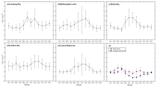 To gain more insight into seasonal variations of Chl-a over different locations, the Bohai Sea was divided into six sub-regions, as described in Section 2.1. The sampling area-averaged 13-year average of monthly Chl-a in the Bohai and northern Yellow Seas are shown in Figure 5. In the Liaodong bay, Qinhuangdao coast and Bohai bay, the seasonal patterns of Chl-a were characterized by a long-lasting Chl-a peak (>2.5 mg·m−3) from May to September (Figure 5a–c). However, in these three areas, seasonal maxima of Chl-a appeared in June (4.7 ± 1.0 mg·m−3), August (4.4 ± 1.7 mg·m−3), and June (4.7 ± 1.7 mg·m−3), respectively. In the central Bohai Sea (Figure 5d), the high Chl-a (>3 mg·m−3) was observed from May, decreased from September, and then remained relatively low during winter. The maximum Chl-a dominated in July or August (3.5 ± 2.0 mg·m−3). Two Chl-a maxima occurred in March (3.7 ± 1.4 mg·m−3) and September (4.1 ± 1.2 mg·m−3) in the Laizhou bay. However, the relatively low Chl-a was identified from April to June (Figure 5e), which was different from those in other coastal regions. Compared with other sub-regions, the Bohai strait had a distinct seasonal pattern of Chl-a with two Chl-a peaks in March (2.8 ± 0.7 mg·m−3) and September (2.2 ± 0.7 mg·m−3) and the lowest Chl-a in summer (Figure 5f). A similar seasonal pattern with the maximum in April (2.5 ± 0.6 mg·m−3) was identified in the northern Yellow Sea, but no maximum occurred in August or September.