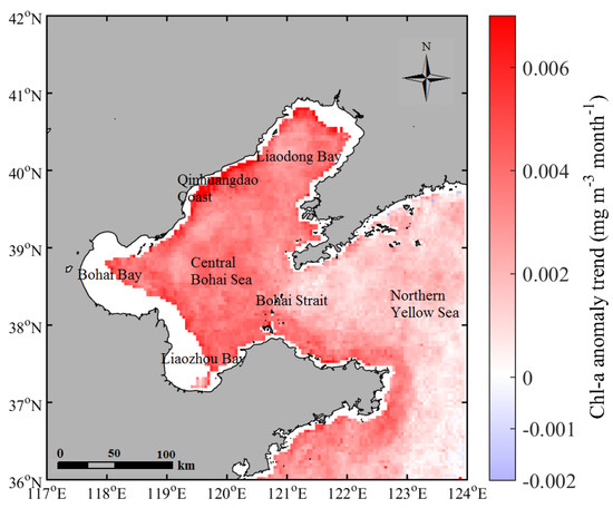 The long-term trend of Chl-a in the Bohai Sea from 2000 to 2012 is shown in Figure 6. In general, the Chl-a trend values in the Bohai Sea were higher compared with those in the northern Yellow Sea. The upward trends (>0.0018 mg·m−3·month−1) were detected in the entire Bohai Sea, and its pattern was heterogeneous. The larger increase in Chl-a (>0.0035 mg·m−3·month−1) prevailed over coastal waters, especially in northern Liaodong bay and Qinhuangdao coast. The central Bohai Sea also had large positive trends (0.0025–0.0038 mg·m−3·month−1). It is noted that some coastal regions in the image, such as the Laizhou bay and Bohai bay, showed invalid pixels (white color) because of small percentage (<70%) of valid pixels.