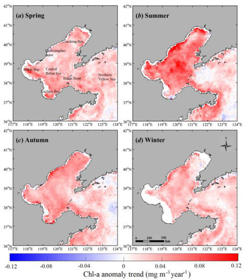 In this study, spring, summer, autumn, and winter were defined as March to May, June to August, September to November, and December to February of the next year, respectively. The patterns of the Chl-a trend across four seasons are shown in Figure 7. Clear spatial and temporal variations of the Chl-a trend were observed in the Bohai Sea. In general, the Chl-a in the Bohai Sea displayed an increasing trend throughout the year. The Chl-a trend during summer and autumn showed higher values than those during winter and spring. At the temporal scale, the Chl-a trend was high in spring in the Bohai bay and Laizhou bay. In summer, the Chl-a trend was highest in most regions of the Bohai Sea, especially in the Bohai bay, Qinhuangdao coast, and central Bohai Sea. During autumn and winter, the Qinhuangdao coastal waters had high Chl-a trend.