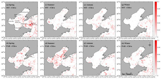 To assess the causality between Chl-a and SST and PAR in the Bohai Sea, we calculated the information flow from the SST anomaly to the Chl-a anomaly (hereafter referred to as IFSST→Chl-a) and those from the PAR anomaly to the Chl-a anomaly (hereafter referred to as IFPAR→Chl-a) in four seasons using Equation (7) (Figure 9). Clearly, both the IFSST→Chl-a and IFPAR→Chl-a values were nonzero in the areas marked by red (Figure 9a,b), in the sense that phytoplankton growth could be affected by PAR and SST in spring. As shown in Figure 9c,d, the IFPAR-Chl-a values were higher than IFSST→Chl-a. The IFPAR→Chl-a values in the Bohai Sea were above zero in summer, which indicated that PAR may be one of the factors affecting the growth of phytoplankton. During autumn, SST mainly showed significant IF in offshore waters (Figure 9e,f). IFSST→Chl-a was close to zero in the Bohai Sea in winter (Figure 9g), thus essentially no causality could be identified here. The causality between PAR and Chl-a occurred in most regions of the Bohai Sea in winter (Figure 9h). These results, as shown in Figure 9, implied that the influences of environmental drivers (PAR and SST) on the Chl-a pattern were complex, which has been confirmed by previous studies [22,41,42]. At this stage, it should be stated that we investigated the causality between Chl-a and SST by mainly considering the indirect influences of SST on Chl-a. This is because the changes in SST may induce stratification or mixing of the water column, which further alter the light and nutrient conditions and thereby impact the phytoplankton growth.