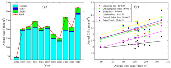 The annual runoff data of the three major rivers from 2002 to 2011 (data from Zhang et al. [54]) (a). The scatter plots between the annual Chl-a of six sub-regions and the annual total runoff from 2002 to 2012 (b).