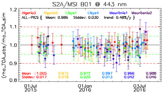 - Lacherade, S.; Fougnie, B.; Henry, P.; Gamet, P. Cross calibration over desert sites: Description, methodology, and operational implementation. IEEE Trans. Geosci. Remote Sens. 2013, 51, 1098–1113. [Google Scholar] [CrossRef]