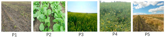 Since one of the objectives of this study is to describe the dynamic change of CP parameters with rape growth parameter changes, it is better to describe the rape growth period with crop temporal evolution, which is usually described by a simple linear interpolator known as the general BBCH scale (from Biologische Bundesanstalt Bundessortenamt and CHemische Industrie) for cereals [26]. In this paper, the whole rape growth cycle was divided into 10BBCH stages according to the particular features and aspects of rape development as a function of time. However, because of the long revisit time of Radarsat-2 (24 days) acquired for this study, several BBCH stages were combined into a principal scale as (1) and (2) into P2, (3), (5), (6) into P3, and so on. The principal stages, the corresponding BBCH scales and the related acquired SAR images are introduced in detail in Table 2.