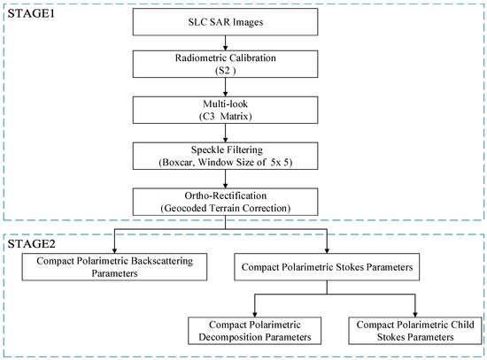 SAR data processing flowchart is shown as STAGE1 in Figure 3. Radarsat-2 FP SLC data were provided as separated real in-phase component (I) and the imaginary quadrature component (Q) for each polarization (HH, HV, VH and VV) in tiff image file format of 32 bits signed integer. The tiff data files for the four polarizations were imported into PolSARPro software (Version 5.0, from the European Space Agency software) as Sinclair matrix S2 shown by Equation (1), and then, the S2 matrix was radiometrically calibrated and calculated into the C3 matrix. The details for S2 radiometric calibration and transformation into the C3 matrix are introduced as follows.
