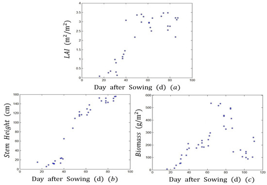Temporal evolution of three growth parameters based on 101 fields over the whole growth cycle. (a) LAI; (b) stem height; (c) biomass. Each point in these plots is the average value of all fields having the same sowing date. The data were only collected after the emergence of the plants.