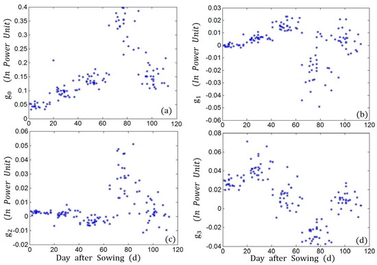 Temporal evolution of four Stokes parameters based on 101 fields over the whole growth cycle. (a) ; (b) ; (c) ; (d) . Each point in these plots is the average value of all fields having the same sowing date. The data were collected during the whole growth cycle of rape.