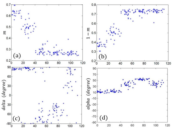 Stokes parameters, which were proposed by Stokes in 1851 [29] and could be represented by four real numbers (), were proven to be a very convenient means to describe the received polarization state, as well as the scattering properties of targets. Taking circular transmission, dual polarization base at the receiver as an example, the four Stokes parameters are shown in Equation (10); for the detailed interpretation of the parameters in Equation (10), the reader is referred to [28]: