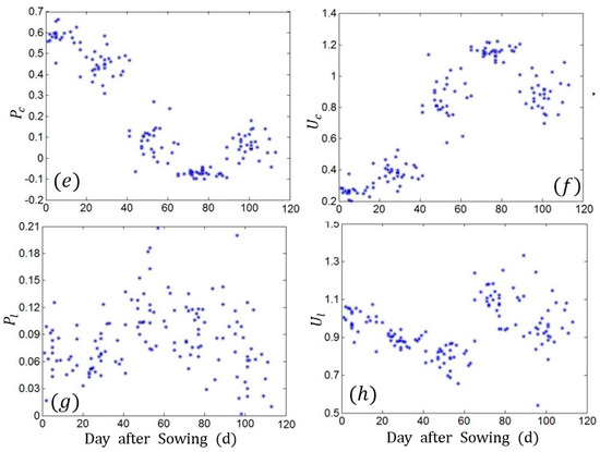 Temporal evolution of four Stokes parameters based on 101 fields over the whole growth cycle. (a) ; (b) ; (c) ; (d) ; (e) ; (f) ; (g) ; (h) . Each point in these plots is the average value of all fields having the same sowing date. The data were collected during the whole growth cycle of rape.