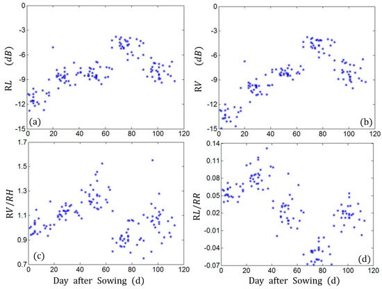 Temporal evolution of four two backscattering parameters and two ratio of backscattering coefficients based on 101 fields over the whole growth cycle. (a) (b) ; (c) (the ratio between backscattering coefficient of channel RV and RH); (d) (the ratio between backscattering coefficient of channel RL and RR). Each point in these plots is the average value of all fields having the same sowing date. The data were collected during the whole growth cycle of rape.