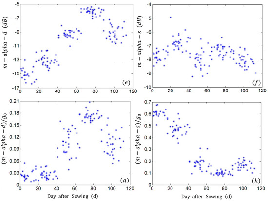 Temporal evolution of four decomposition parameters based on 101 fields over the whole growth cycle. (a) m-delta-d; (b) m-delta-s; (c) m-delta/alpha-v; (d) v/(d + s); (e) m-alpha-d; (f) m-alpha-s; (g) m-alpha-d/; (h) m-alpha-s/. Each point in these plots is the average value of all fields having the same sowing date. The data were collected during the whole growth cycle of rape.